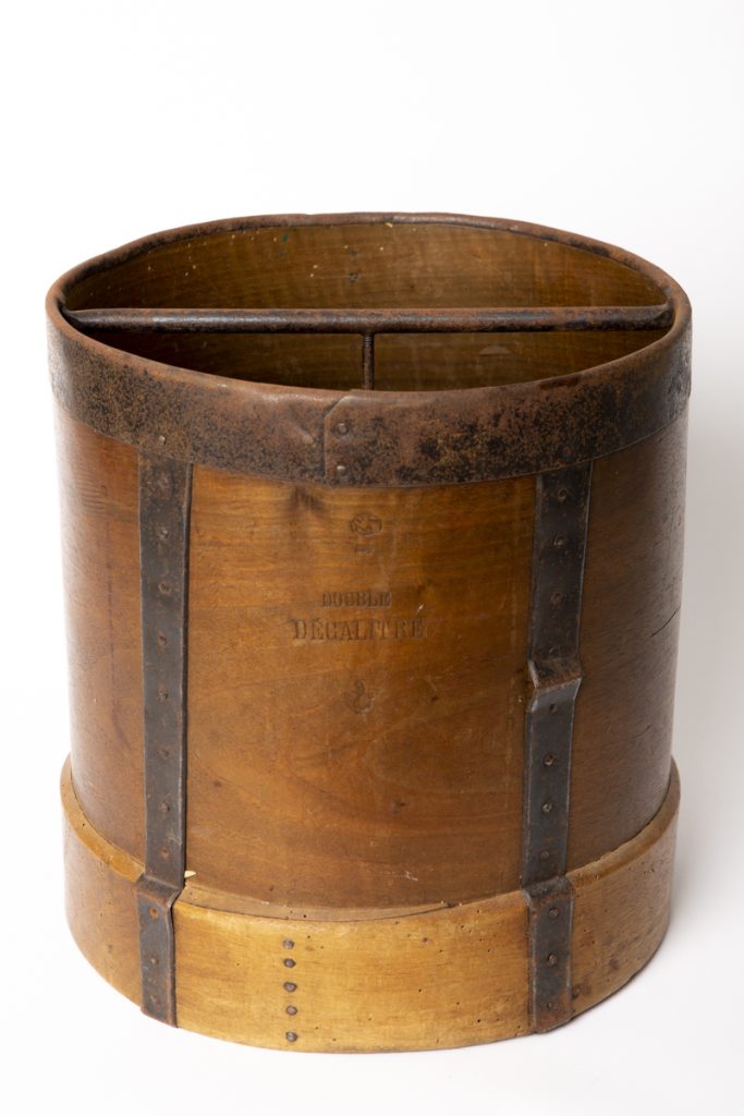 A French grain measuring bucket from the late 19th to early 20th century, stamped Double Decalitre. Once a working tool, now a striking decorative piece with real provenance.