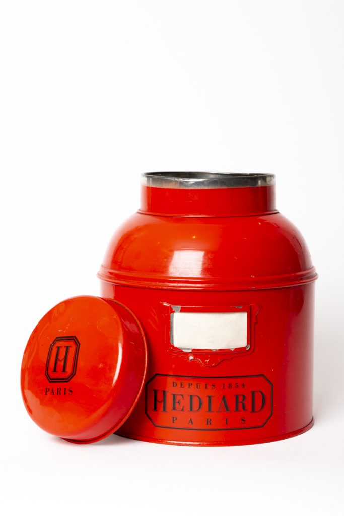 A red-and-black Hédiard Paris tea canister, once used in the iconic Parisian delicatessens to store and showcase premium teas. A collectible piece with true Parisian heritage.